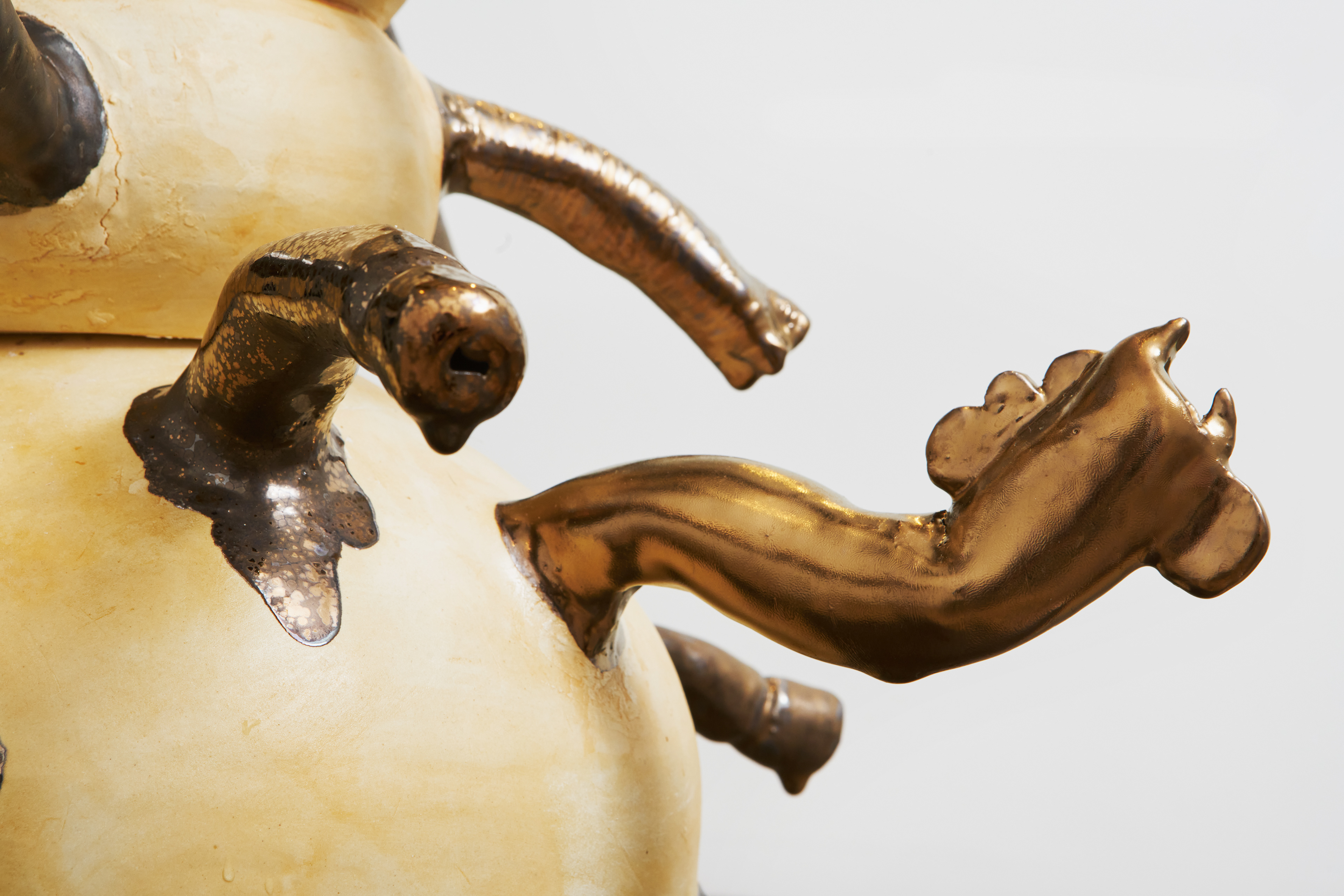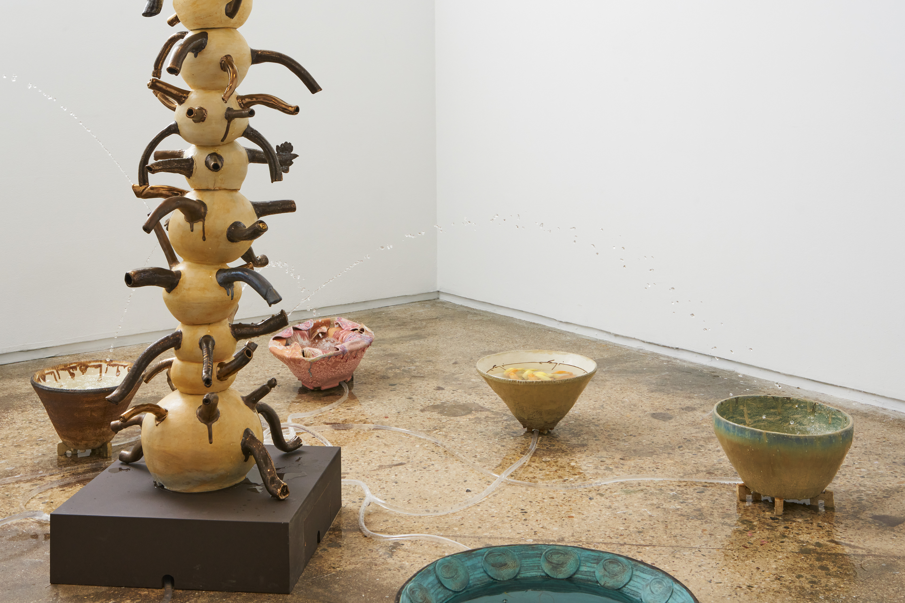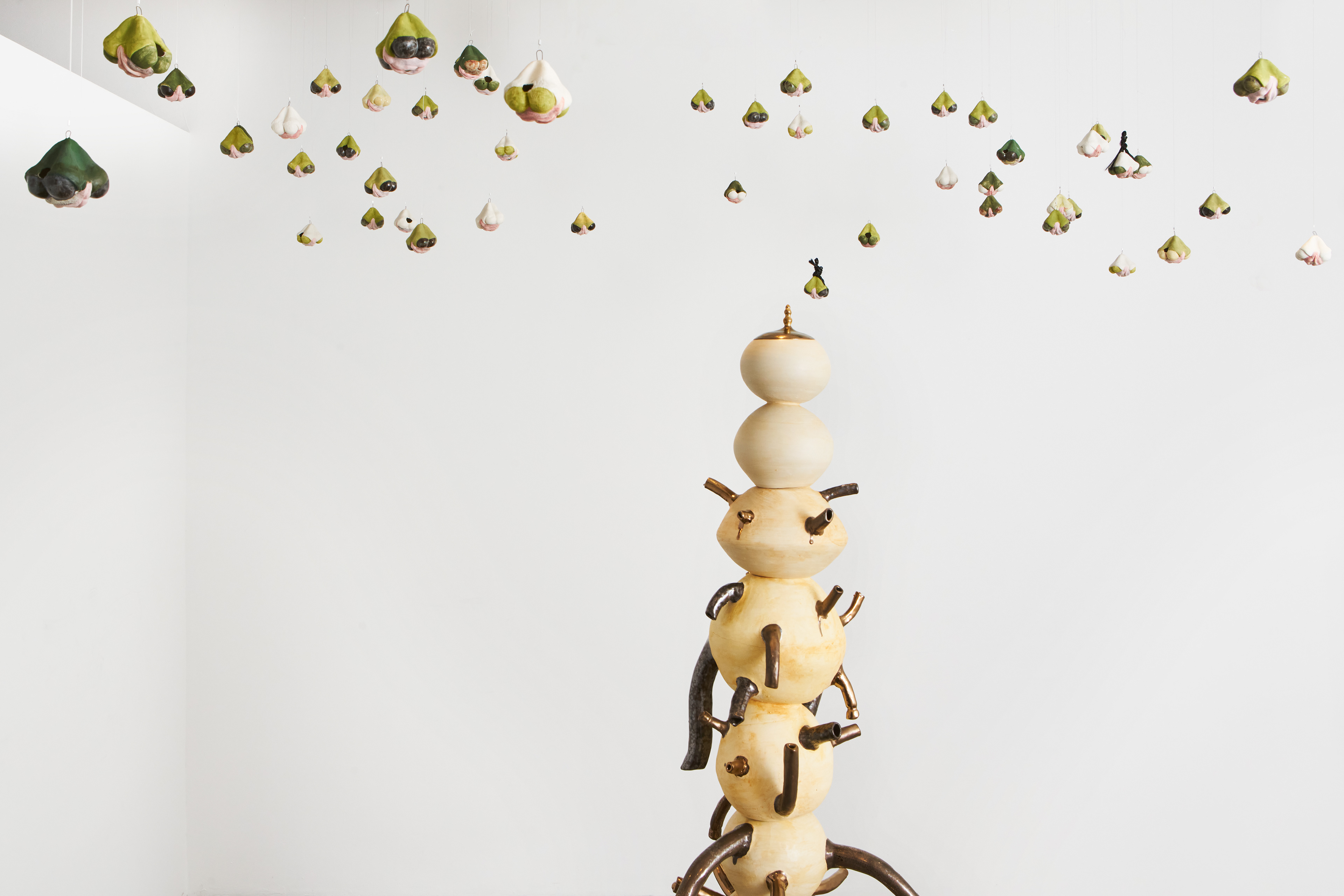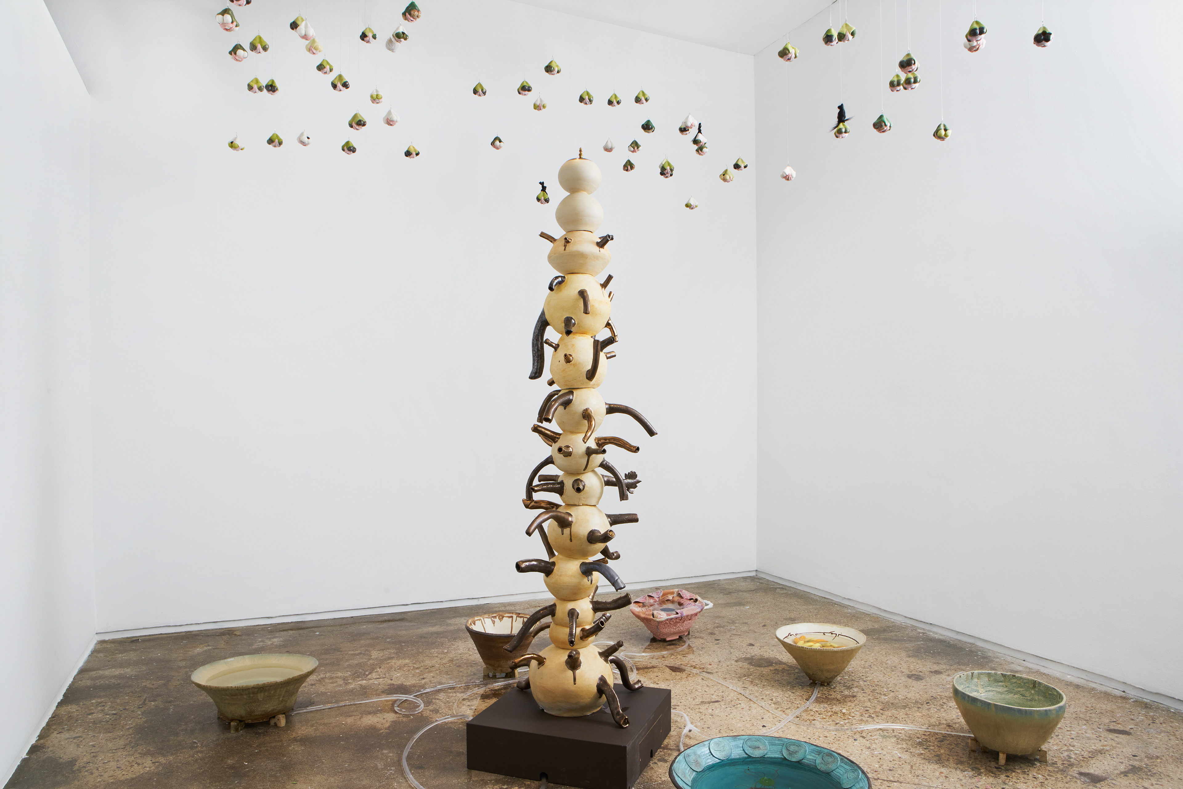 Nava Derakhshani identifies as a global diasporic artist whose personal and familial histories strongly inform the direction of her multidisciplinary art-making. Her Golden Samovar installation is a cleverly sardonic critique of patriarchy albeit through a post-colonial Farsi perspective. In the center of the space, a custom-designed fountain made from a stack of thrown Persian-style teapots is rendered in an asymmetrical, slightly tilting, off-kilter position. Protruding golden spouts that deliberately resemble penises are situated in all-over arrangement along the fountain, similar to Yayoi Kusama’s playful use of phallic motifs in her 1960s soft sculptures. Plastic tubes connected to the sculptural phalluses transfer water from the fountain to the wide ceramic dishes on the floor surrounding the sculpture. A flock of miniature testicular shapes with eyes are suspended from the ceiling with their gaze directed below at the fountain and the viewer. The application of traditional Persian art & design techniques and explicit body humor effectively scrutinizes male hegemony, especially the long-held views of male sexual physiognomy being synonymous with power and authority.