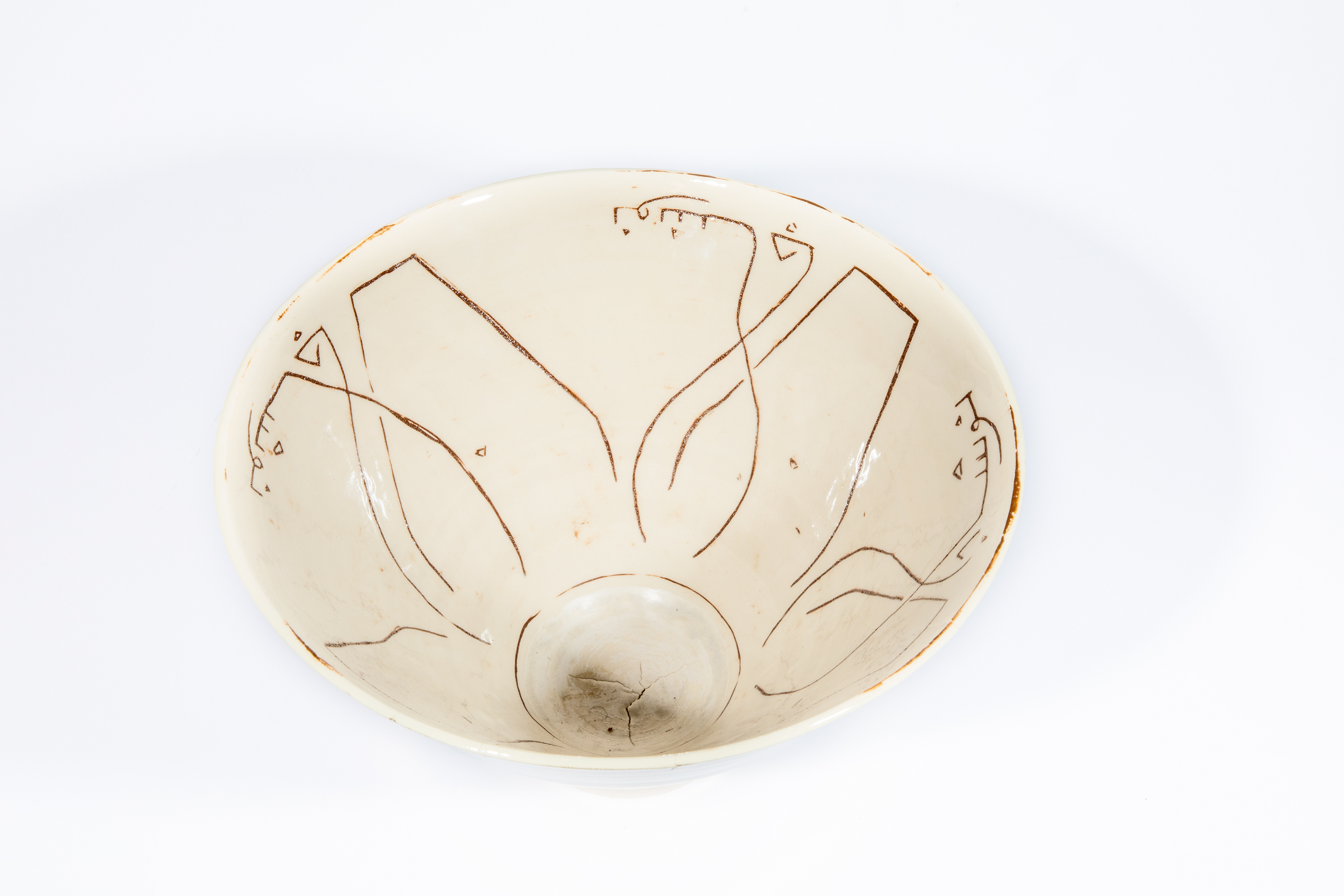 In these vessels, I reference museum artifacts collected from the SWANA region: Ceramic bowls inscribed with verses of Arabic poetry or proverbs. I’ve made my own bowls and decorated them with welcoming Farsi phrases: Befarma (please come/help yourself) and Nooshe Jan (may this food/drink nourish your soul). In doing so, I seek to reclaim elements of cultural identity entangled in the logics of imperial collection and display, recontextualizing them from static relics to living forms of language, gesture, and care. These phrases are welcoming invitations, spoken in homes and affectionately whispered over shared meals.